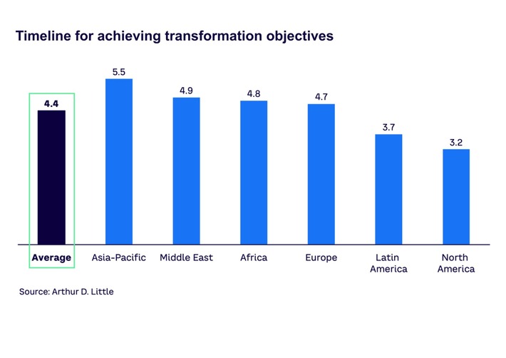 71 % der Unternehmen planen mit einem Zeitraum von vier bis sechs Jahren, 32 % konzentrieren sich dabei auf fünf Jahre. Die durchschnittlichen Zeiträume reichen jedoch von 3,2 Jahren in Nordamerika über 4,9 Jahre im Nahen Osten bis hin zu 5,5 Jahren in Asien-Pazifik.