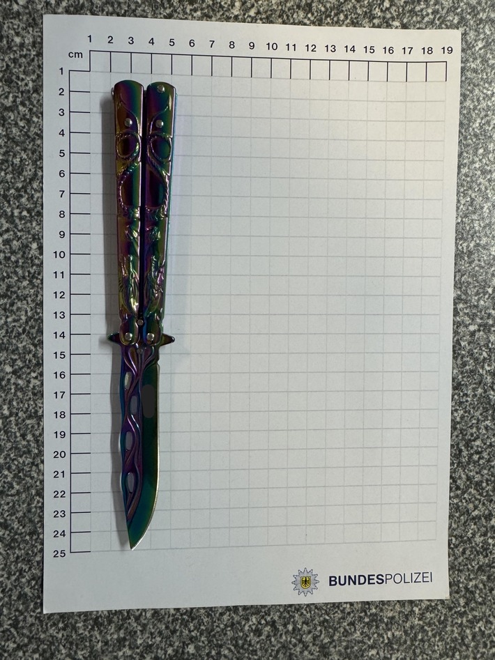 Am 22. August gegen 23:30 Uhr stellten Bundespolizisten im Gelsenkirchener Hauptbahnhof einen 28-jährigen Mann fest. Da der Gelsenkirchener angab, keinen Ausweis zu besitzen, durchsuchten die Beamten ihn nach weiteren Identitätsdokumenten. Hierbei fanden die Einsatzkräfte ein verbotenes Butterflymesser. Dabei handelt es sich um ein Faltmesser mit zweigeteilten, auf einer Ebene schwenkbaren Griffen.
