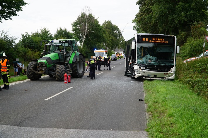 Am Donnerstagnachmittag, den 07.08.2025, wurde der Löschzug Waldniel gemeinsam mit dem Leitungsdienst um 16:09 Uhr zu einem Verkehrsunfall auf der Straße Steeg in Schwalmtal alarmiert. Ein Linienbus war mit einer landwirtschaftlichen Zugmaschine kollidiert. Beim Eintreffen der Feuerwehr befand sich ein Krankentransportwagen bereits an der Einsatzstelle. Die Lage war zunächst unübersichtlich.