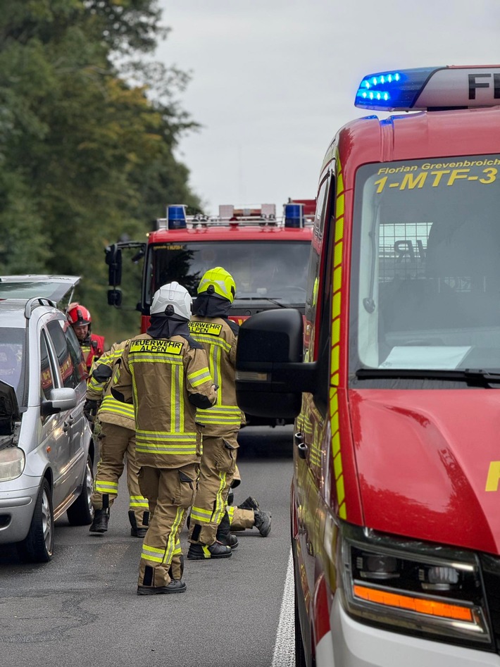 Die Feuerwehr Alpen übernahm dann die Einsatzstelle, klemmte die Fahrzeugbatterie ab und führte eine Abschlusskontrolle mit der Wärmebildkamera durch. Des Weiteren wurden ausgelaufene Betriebsmittel abgestreut und das Bindemittel der fachgerechten Entsorgung zugeführt.