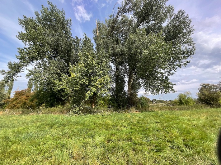 Während eines kurzen Gewitters schlug ein Blitz in einen Baum ein. Durch den Blitz entzündete Äste stürzten auf die Vegetation unter dem Baum und entzündeten diese ebenfalls. Die Freiwillige Feuerwehr Alpen rückte mit allen drei Einheiten aus. Vor Ort wurde die entsprechende Brandbekämpfung mit zwei C-Rohren sowie zwei D-Rohren vorgenommen. Letztere kommen unter anderem auf Grund ihres geringeren Gewichtes speziell bei Vegetationsbränden zum Einsatz. Mit einem Tanklöschfahrzeug wurde die Löschwasserversorgung sichergestellt, da sich die Einsatzstelle nicht direkt an öffentlichen Verkehrswegen befand. Gemeinsam mit einem Landwirt wurde im betroffenen Bereich das Brandgut auseinandergezogen und mittels Frontwerfer des Tanklöschfahrzeuges abgelöscht. Mit einer Wärmebildkamera wurde der Bereich abschließend ohne weitere Feststellungen kontrolliert. 20 Einsatzkräfte waren ca. zwei Stunden im Einsatz.