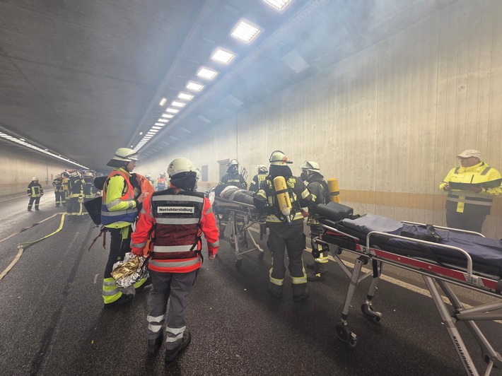 Das Szenario: Zwei Pkw kollidierten im hinteren Bereich des Tunnels in Fahrtrichtung Brilon. Ein Fahrzeug lag auf der Fahrerseite an der linken Tunnelwand, eine Person war darin eingeschlossen. Der zweite Pkw war rund zehn Meter weiter rechts in die