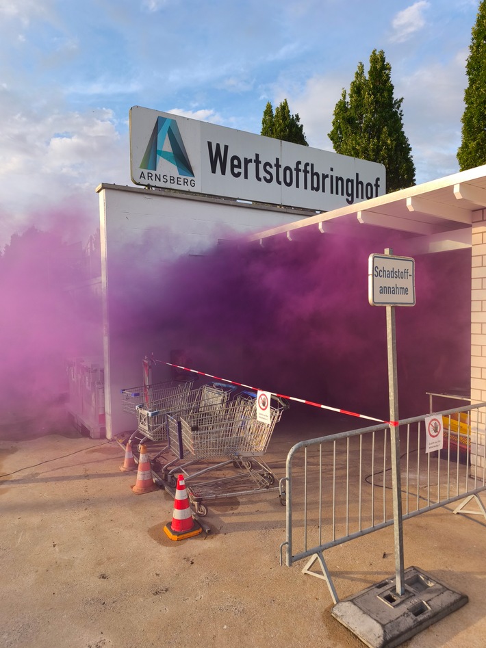 Am Wertstoffhof in Obereimer stieg farbiger Qualm auf – besorgte Bürger alarmierten die Feuerwehr. Doch Entwarnung: Es handelte sich um eine Übung. Szenario war ein Unfall im Gefahrstofflager mit Austritt eines unbekannten Stoffes und einem vermissten Mitarbeiter.
