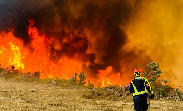 Ganz anders gestaltete sich der Sonntag. Unter anderem aufgrund sich drehender Winde entwickelten sich mehrere Einzelbrände ab Mittag zu einer kilometerlangen Flammenfront, die sich den gegenüberliegenden Abhang in Richtung des Dorfes ausbreiteten. Unmittelbar nach ihrem Eintreffen bekamen die Tanklöschfahrzeuge daher die ersten Einsatzaufträge. Gemeinsam mit anderen spanischen Einsatzeinheiten war unser Einsatzteam in beiden Dienstschichten gefordert. Durch den dynamischen Einsatz am Boden an drei Feuerfronten gelang es, den Ort La Baña gegen die Flammen zu verteidigen. Die notwendige Unterstützung kam hierzu auch aus der Luft: Mit bis zu sechs Löschflugzeugen und zehn Löschhubschraubern gleichzeitig konnten die zum Teil mehr als 50 Meter hohen Flammen verringert oder für Fahrzeuge und fußläufige Einsatzkräfte unerreichbare Bereiche abgelöscht werden. Unter Beobachtung zahlreicher besorgter Anwohner konnte so zunächst ein durch die starken Winde angefachtes, sich unkontrolliert ausbreitendes Feuer unter anderem am Überspringen einer wichtigen Straße gehindert werden. Zudem positionierten sich mehrere deutsche und spanische Tanklöschfahrzeuge entlang einer knapp 1.500 Meter durch den Einsatz von Bulldozern erzeugten Sicherheitsstreifen. Mit einem massiven Strahlrohreinsatz konnten die Einsatztrupps beim Ankommen des Feuersaums eine Fortentwicklung über diese Sicherheitslinie hinaus verhindern. Die notwendige Unterstützung kam hierzu auch aus der Luft: Mit bis zu sechs Löschflugzeugen und zehn Löschhubschraubern gleichzeitig konnten die zum Teil mehr als 50 Meter hohen Flammen verringert oder für Fahrzeuge und fußläufige Einsatzkräfte unerreichbare Bereiche abgelöscht werden. Der anschließende Mob Up, also umfangreiche Nachlöscharbeiten mit Wasser und Handwerkzeugen, war erforderlich, um Glutnester abzulöschen und ein weiteres Aufflammen zu verhindern.