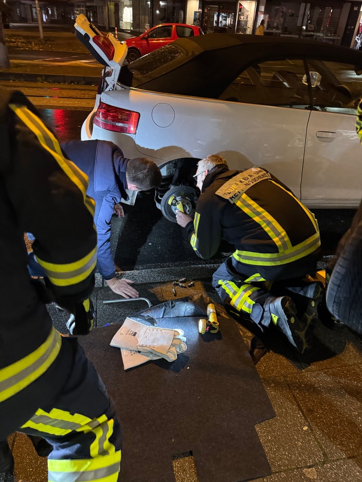 Am gestrigen Abend gegen 21:15 erhielt die Leitstelle der Feuerwehr Bochum einen Anruf, dass sich vermutlich eine Katze unter der Stoßstange eines PKW befindet.