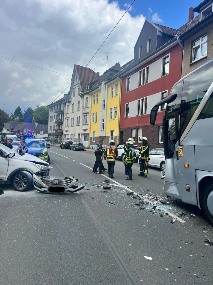 Um 12:38 Uhr erreichte der automatische E-Call eines PKW in der Westenfelder Straße die Leitstelle der Feuerwehr Bochum. Der zuständige Löschzug der Feuerwache Wattenscheid traf mit Einsatzkräften des Rettungsdienstes bereits nach wenigen Minuten an der nahe gelegenen Einsatzstelle ein. Dort waren ein SUV und ein Reisebus frontal zusammengestoßen. Nach einer ersten Sichtung waren insgesamt 6 Personen an dem Unfall beteiligt. 5 Personen aus dem PKW, darunter 4 Kinder wurden, zum Teil schwerverletzt, von Notfallsanitätern und einer Notärztin vor Ort behandelt und in ein Gelsenkirchener Krankenhaus gebracht. Der Fahrer des Reisebus war unverletzt und konnte vor Ort verbleiben. Der Einsatz der Feuerwehr beschränkte sich auf die Sicherung der Fahrzeuge sowie die Unterstützung des Rettungsdienstes.