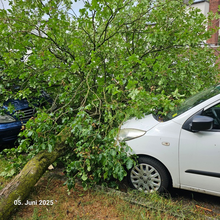 Ein kurzes, aber heftiges Unwetter sorgte am Donnerstagnachmittag für wetterbedingte Einsätze der Feuerwehr Bocholt. Zwischen 15:03 Uhr und 17:00 Uhr mussten die Einsatzkräfte insgesamt drei Einsatzstellen im nördlichen Stadtgebiet anfahren, um umgestürzte Bäume zu beseitigen und Gefahrenstellen zu sichern.