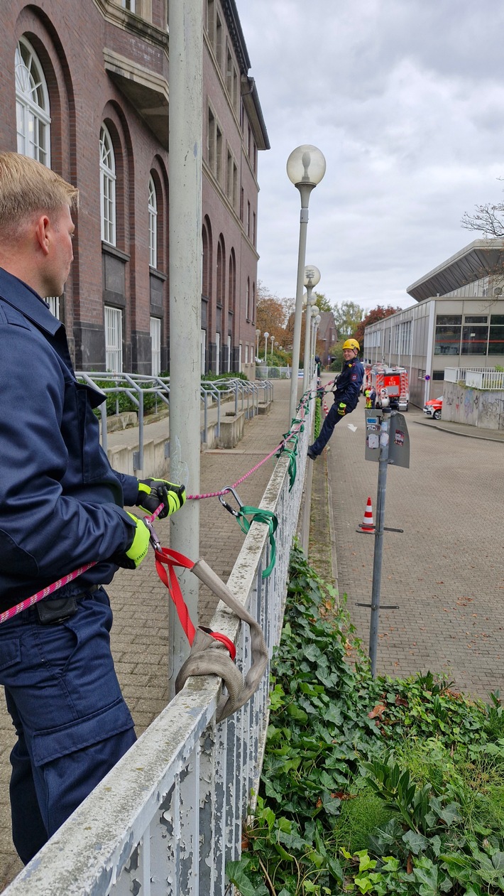 Damit die nötigen Handgriffe sitzen, übt die Feuerwehr Bottrop regelmäßig sowohl am Standort als auch im Stadtgebiet. Heute diente das Geländer am Rathaus gegenüber dem Saalbau als Übungsobjekt. Die Einsatzkräfte sollten im horizontalen Vorstieg vorgehen. Dazu werden so genannte Zwischensicherungen mit Bandschlingen und Karabinern gesetzt, um die Absturzhöhe immer möglichst gering zu halten. Die vorgehende Einsatzkraft wird dabei von zwei Kollegen gesichert. Die Absturzsicherung dient dem Eigenschutz der Einsatzkräfte.