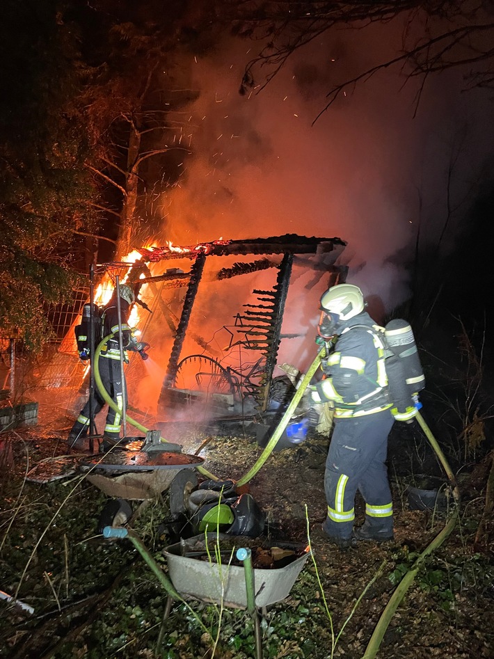 Am frühen Dienstagmorgen entdeckten zwei Passanten im Ortsteil Hiesfeld in der Nähe Ihres Wohnortes einen starken Feuerschein und Funkenflug und alarmierten die Feuerwehr. Aufgrund der zunächst unklaren genauen Lage der Einsatzstelle gestaltet sich die Erkundung für die Einsatzkräfte trotz der bereits weiten Entwicklung des Feuers schwierig. Nachdem der Ort und die genaue Lage festgestellt waren, wurde durch die Feuerwehr ein zweiseitiger Löschangriff unter schwerem Atemschutz durchgeführt, um eine weitere Ausbreitung der Flammen zu verhindern. Insgesamt standen zu diesem Zeitpunkt jedoch bereits zwei Gartenhütten in Vollbrand und das Feuer hatte weiterhin auf die umgebende Vegetation und einen großen Brennholzstapel übergegriffen. An den beiden Schuppen entstand ein Totalschaden. Menschen oder Tiere kamen nicht zu Schaden.