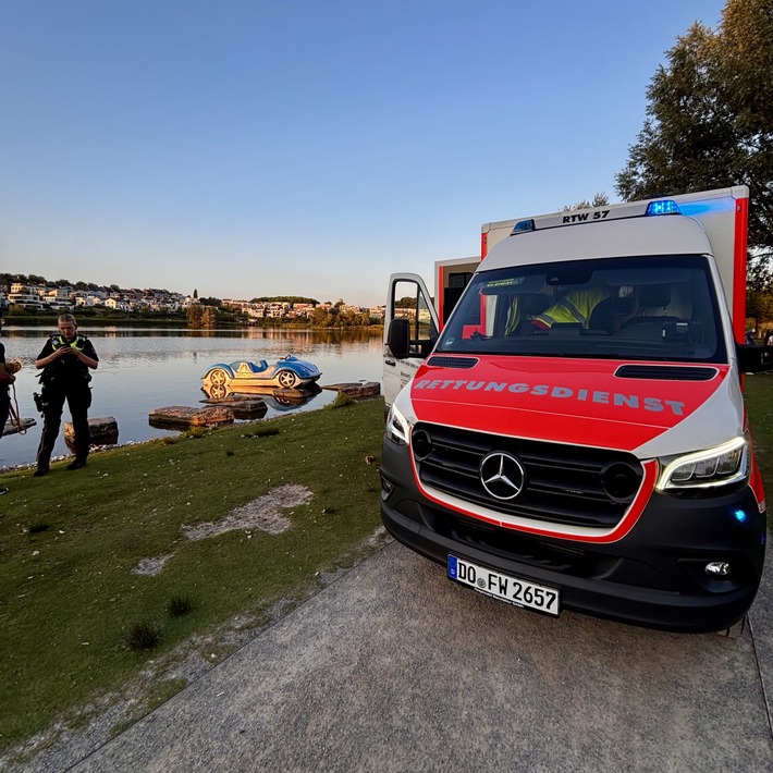 Am Sonntagabend gegen 20:00 Uhr wurde die Feuerwehr Dortmund mit einem Großaufgebot zum Phoenix-See alarmiert. Grund der Alarmierung war ein gemeldeter Wasserunfall: Ein Tretboot mit vier Personen an Bord war aus bisher ungeklärter Ursache mittig auf dem See gekentert.