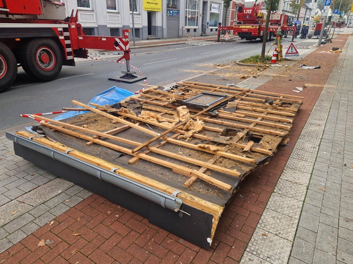 Das Dach hat eine ungefähre Grundfläche von 220 m². Die Dachkonstruktion muss, aufgrund der nicht mehr vorhanden Stabilität, von den Einsatzkräften weitgehend zurückgenommen werden.