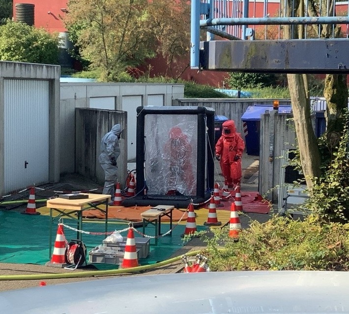 Die Leitstelle der Feuerwehr alarmierte unter dem Einsatzstichwort „TH ABC-Land-2“ eine größere Anzahl an Einsatzkräften mit speziellen Gerätschaften und Einheiten für Gefahrstoffeinsätze. Vor Ort stellte sich heraus, dass ein Gasflaschenventil undicht war. Um die Gefahr sicher zu beseitigen, gingen die Einsatzkräfte unter Vollschutz in Chemikalienschutzanzügen (CSA) vor. Mit Spezialwerkzeug konnte die Undichtigkeit am Gasflaschenventil abgedichtet werden.