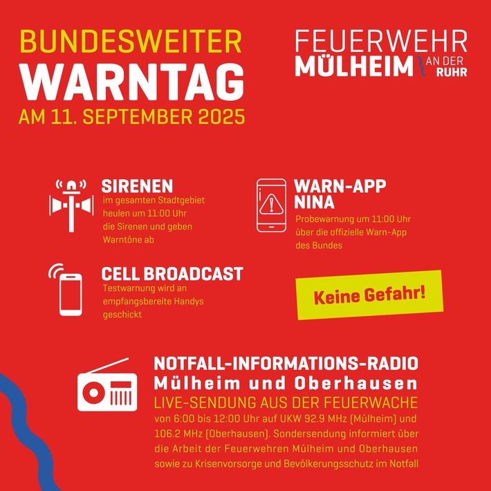 Am Warntag wird zusätzlich das Notfall-Informations-Radio der Städte Mülheim und Oberhausen aktiviert. Aus dem eigens eingerichteten Radiostudio der Hauptfeuer- und Rettungswache in Mülheim an der Ruhr sendet Radio Mülheim ein Sonderprogramm, das auf der UKW-Frequenz 92,9 MHz ausgestrahlt wird. Erstmals wird dieses Programm in diesem Jahr zeitgleich auch in Oberhausen auf 106,2 MHz übertragen. Von 6:00 bis 12:00 Uhr sendet das Team von Radio Mülheim und Radio Oberhausen live in enger Zusammenarbeit mit den beiden Feuerwehren eine Sondersendung zum Warntag.