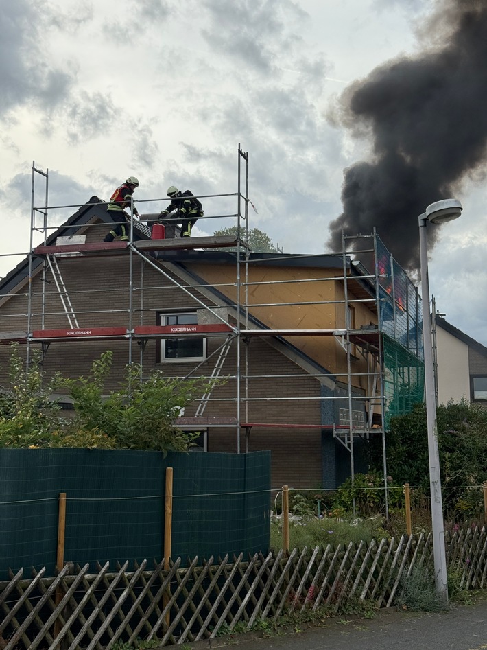 Am heutigen Donnerstagnachmittag wurde die Feuerwehr Mülheim an der Ruhr zu einem Dachstuhlbrand im Stadtteil Heißen alarmiert. Nachbarn meldeten eine starke Rauchentwicklung aus dem Dach eines im Umbau befindlichen Einfamilienhauses. Bei Eintreffen der ersten Einsatzkräfte waren bereits eine schwarze Rauchsäule und Flammenschein über dem betroffenen Haus erkennbar. Durch die Einsatzkräfte der Feuerwache Heißen wurde umgehend eine Drehleiter zur Brandbekämpfung in Stellung gebracht. Parallel dazu wurde eine Gasflasche, die sich auf dem Dach des Gebäudes befand, aus dem Gefahrenbereich gezogen und gekühlt. Durch weitere Einsatzkräfte der Feuerwache 1 wurde das Innere des Wohngebäudes auf Brand- und Rauchausbreitung kontrolliert. Hier konnte schnell Entwarnung gegeben werden – das Feuer beschränkte sich ausschließlich auf die Dachkonstruktion des Hauses.
