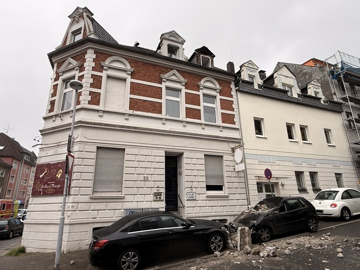 Am Mittwochmorgen gegen 8:00 Uhr wurde die Feuerwehr Mülheim an der Ruhr zu einem Einsatz in die Trooststraße gerufen. An einem Wohngebäude in Höhe der Kampstraße waren Fassadenteile im Bereich einer Dachgaube herabgestürzt. Die Trümmerteile fielen auf die Fahrbahn und beschädigten dabei zwei geparkte Fahrzeuge.