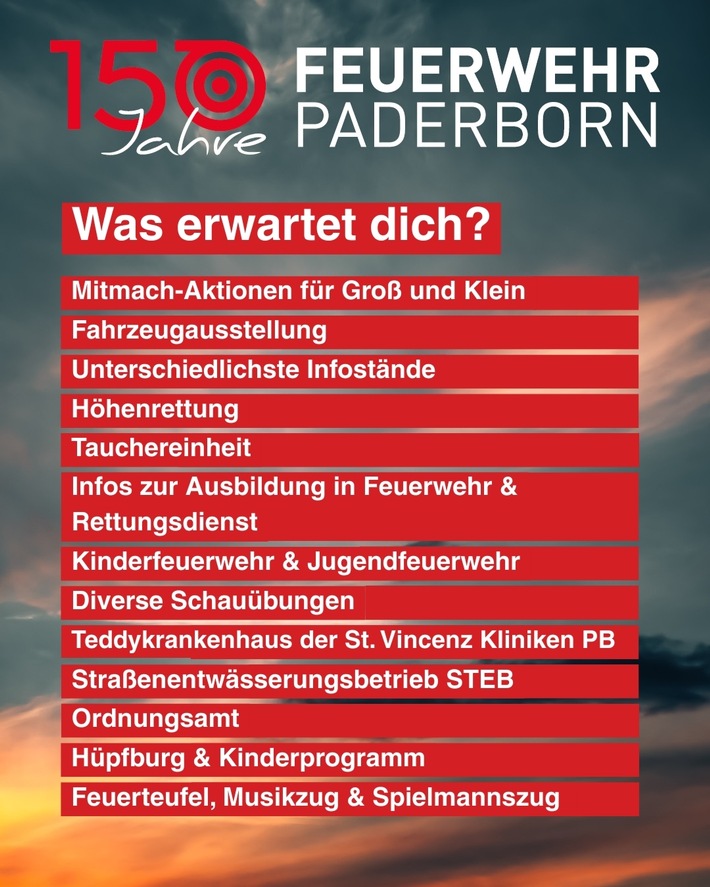 Am Sonntag, 07.09.2025, findet an der Feuer- und Rettungswache Süd an der Breslauer Str. der Tag der offenen Tür der Feuerwehr Paderborn statt.