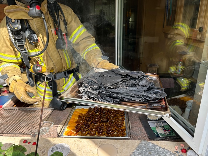 Die Einsatzkräfte haben dann unter Atemschutz das zusätzliche Backblech mit den „gelagerten“ Papiertüten in den Garten getragen und dort mit einem Kleinlöschgerät abgelöscht.
