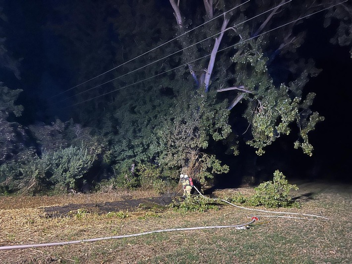 Mithilfe von Notschlüsseln und manueller Steuerung der Hallentore konnten die Einsatzkräfte ohne große Verzögerung ausrücken. An der gemeldeten Einsatzstelle war ein größerer Ast aus einem Baum herausgebrochen und auf eine Stromleitung gefallen. Hierdurch war die Stromleitung stark beschädigt worden und die umliegende Böschung auf rund 30 Quadratmetern in Brand geraten. Das Feuer wurde durch einen Angriffstrupp unter Atemschutz rasch gelöscht.