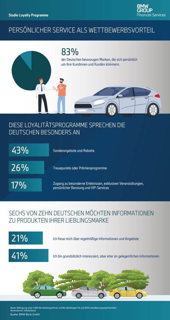 Für die Studie „Loyalty Programme“ im Auftrag der BMW Bank wurden 1.000 Bundesbürgerinnen und -bürger im Juli 2025 online befragt. Die Auswahl der Befragten ist repräsentativ nach Alter, Geschlecht und Bundesland erfolgt.