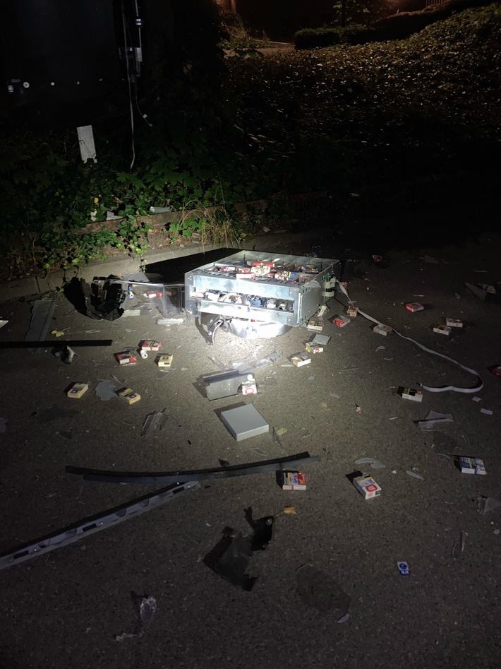 Die Polizeibeamtinnen und -beamten fanden einen zerstörten Zigarettenautomaten vor: Zahlreiche Zigarettenschachteln, Münzen und das Gehäuse des Automaten lagen auf dem Boden verteilt. Der unbekannte Täter, der dunkel gekleidet gewesen sein soll, konnte im Umfeld nicht mehr angetroffen werden.