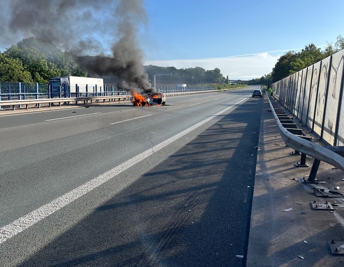 FR / Bielefeld / A2 – Am Dienstagmorgen, 02.09.2025, geriet ein Auto auf der A2 nach einer Kollision mit einem weiteren Auto in Brand. Zwei Personen erlitten leichte Verletzungen.