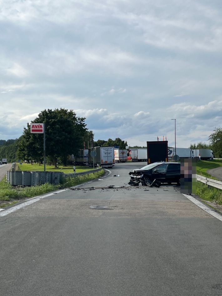 Der Pkw blieb mit starken Beschädigungen im Frontbereich quer in der Zufahrt stehen. Vorsorglich wurden ein Rettungswagen und die Feuerwehr zur Unfallstelle entsandt. Da der Fahrer glücklicherweise unverletzt war, konnten die Rettungskräfte den Unfallort schnell wieder verlassen. Der Pkw wurde abgeschleppt. Für die Dauer der Unfallaufnahme und Bergung des Peugeot blieb die Zufahrt zur Raststätte für ca. eine Stunde gesperrt. Verkehrsbehinderungen traten nicht auf. Der Sachschaden wird auf circa 12000 Euro geschätzt.