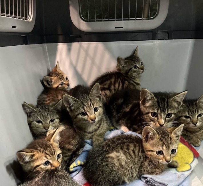Die herbeigerufenen Polizeibeamten konnten die kleinen Samtpfoten einfangen. Nach einer Kuschel-Runde wurden die Katzenbabys der Tierrettung übergeben.