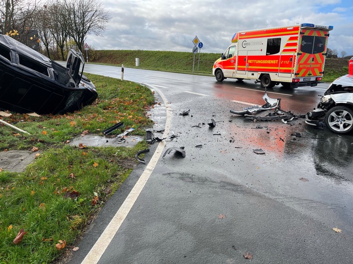 Zwei Autos sind am Montag (17.11.25) an der Kreuzung Ludgerusweg, L580 zusammengestoßen. Gegen 11.10 Uhr befuhr ein 74-jähriger Alsfelder in seinem Auto den Ludgerusweg. Als er die L580 queren wollte, kam es zum Zusammenstoß mit einem 58-jährigen Autofahrer aus Rosendahl, der auf der Landstraße in Richtung Rorup unterwegs war. Durch die Kollision überschlug sich das Auto des Rosendahlers. Neben den beiden Fahrern kam auch die Mitfahrerin des 74-Jährigen verletzt in ein Krankenhaus. Die Straße war während der Unfallaufnahme gesperrt.