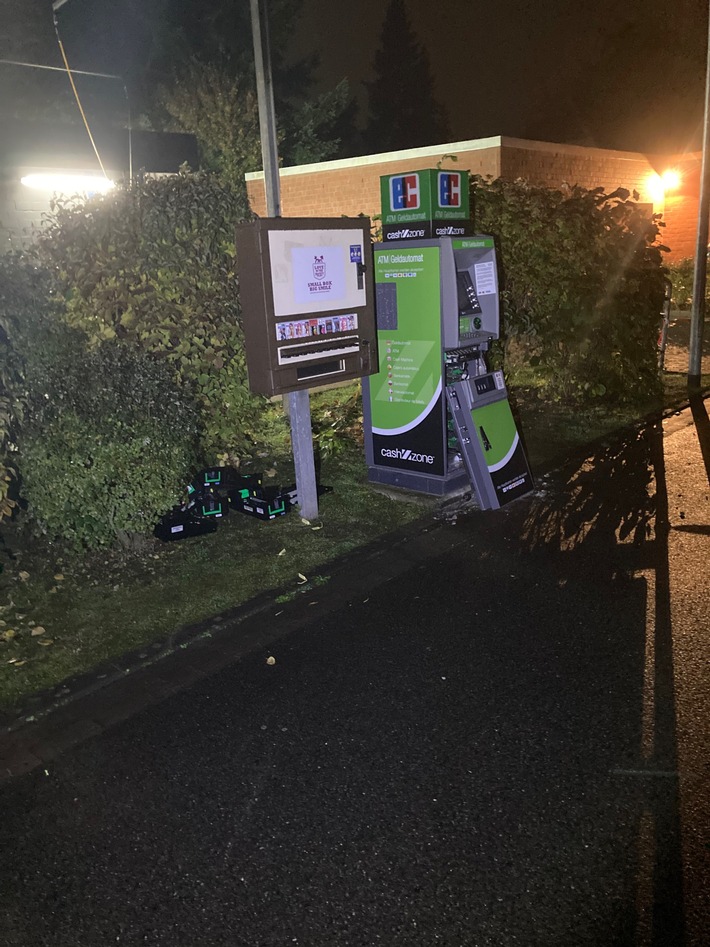 Erste Zeugenhinweise ergaben, dass gegen 03.20 Uhr ein dumpfer Knall aus Richtung des Geldautomaten zu hören war.