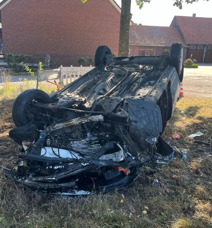 Das Auto prallte gegen einen Findling sowie den Pfahl eines Straßenschildes. Durch den Aufprall schleuderte der Findling rund 30 Meter über ein Grundstück. In der Folge kollidierte der 21-Jährige mit einem weiteren Findling. Das Auto blieb auf der dortigen Wiese auf dem Dach liegen. Anschließend geriet dieses in Brand. Der Fahrer konnte sein Fahrzeug jedoch eigenständig verlassen. Er kam verletzt mit einem Rettungswagen in ein Krankenhaus. Die Straße war während der Unfallaufnahme gesperrt.