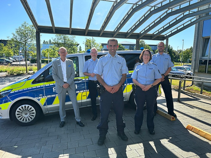 Bild (v.l.n.r.) Landrat Sven-Georg Adenauer, Polizeidirektor Dirk Zeller, Polizeioberkommissar Mustafa Solmaz, Polizeihauptkommissarin Tanja Lindahl und Polizeihauptkommissar Dirk Wienkenhoff