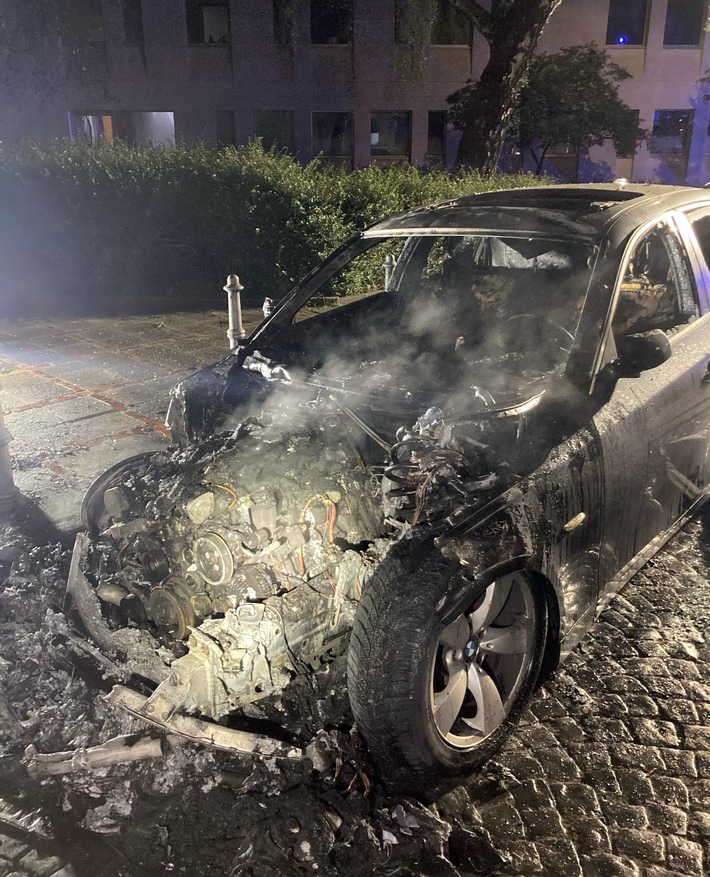 Aufmerksame Zeugen meldeten gegen 4 Uhr einen in Brand stehenden weißen 4er BMW an der Berliner Straße in Höhe der Hausnummer 95. Die Feuerwehr war schnell vor Ort und konnte den Brand löschen. Dennoch brannte der BMW vollständig aus. Zudem wurden ein davor abgestellter VW Transporter und ein dahinter geparkter Nissan Micra durch das Feuer leicht beschädigt. Der Gesamtschaden wird auf einen fünfstelligen Betrag geschätzt.