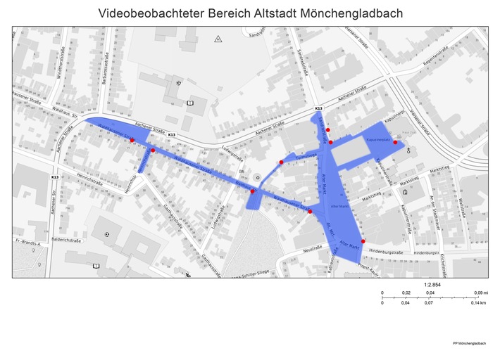 Die seit dem Jahr 2004 an Wochenenden angeordnete Videobeobachtung in der Mönchengladbacher Altstadt ist mit Wirkung zum 1. September um weitere zwölf Monate verlängert worden. Der videobeobachtete Bereich bleibt identisch (siehe Karte).