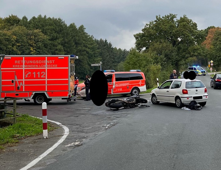Der Biker stürzte und zog sich leichte Verletzungen zu. Nach einer Erstversorgung durch den Rettungsdienst wurde er ins Krankenhaus Lübbecke gebracht. Bei beiden Fahrzeugen entstanden erhebliche Schäden.