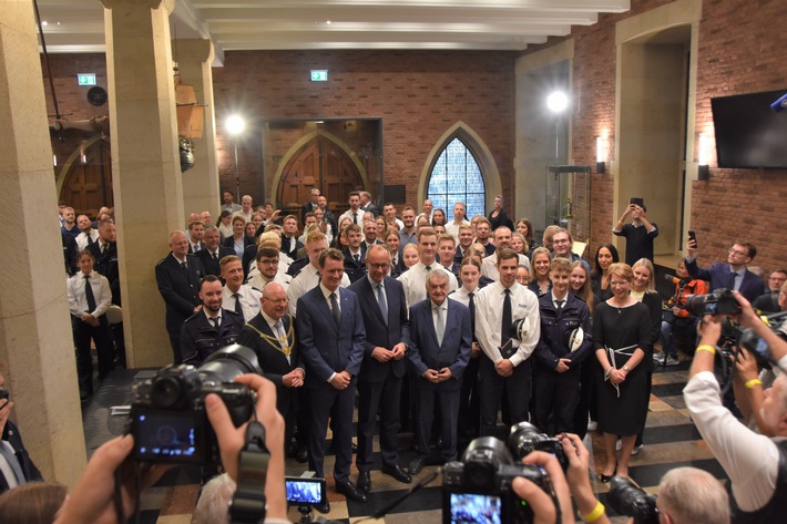 Die neuen Mitarbeiterinnen und Mitarbeiter waren zunächst im festlichen Ambiente des Erbdrostenhofs empfangen worden. Im Anschluss ging es in das Historische Rathaus, wo Bundeskanzler Friedrich Merz, Ministerpräsident Hendrik Wüst und Innenminister Herbert Reul sie feierlich begrüßten.