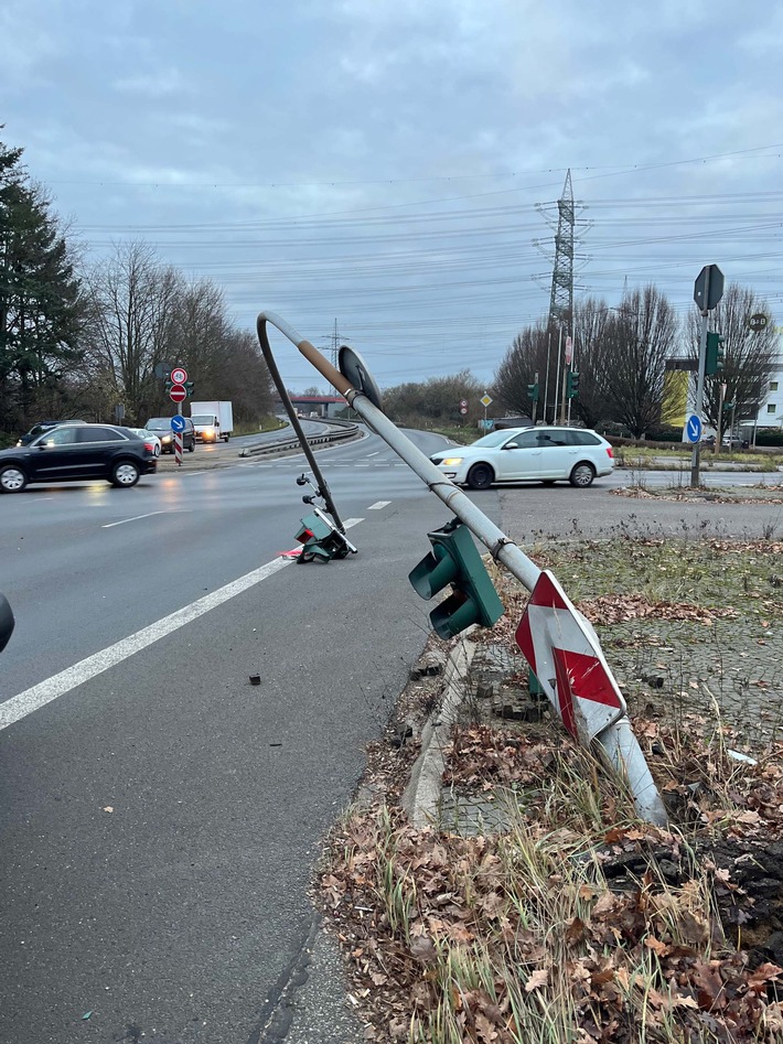 Gegen 8.30 Uhr meldeten mehrere Zeugen bei der Polizeileitstelle einen umgeknickten Ampelmast auf der Holzstraße im Kreuzungsbereich zur Kölner Straße. Als die Polizisten vor Ort eintrafen, fanden sie dort auch den mutmaßlichen Unfallverursacher in seinem beschädigten Audi vor. Der 40-Jährige zeigte stark verzögerte Reaktionen, Konzentrationsschwierigkeiten und eine undeutliche Aussprache. Ein Atemalkoholtest zeigte einen Wert von über 1,5 Promille.