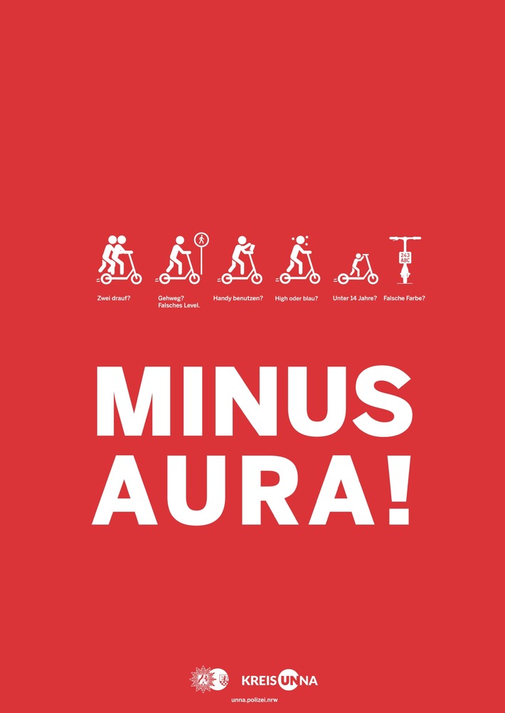 Ebenfalls hat es sich die Kreispolizeibehörde Unna zur Aufgabe gemacht, mit der Kampagne an Schulen heranzutreten. Der Bezirks- und Schwerpunktdienst wird in den kommenden Tagen noch vor den Sommerferien Plakate an Schulen verteilen, damit diese dort aufgehängt werden. Zu sehen sind auf den rot-weißen Plakaten alles das, was auf E-Scootern NICHT erlaubt ist mit dem dazugehörigen Kampagnenspruch „Minus Aura!“
