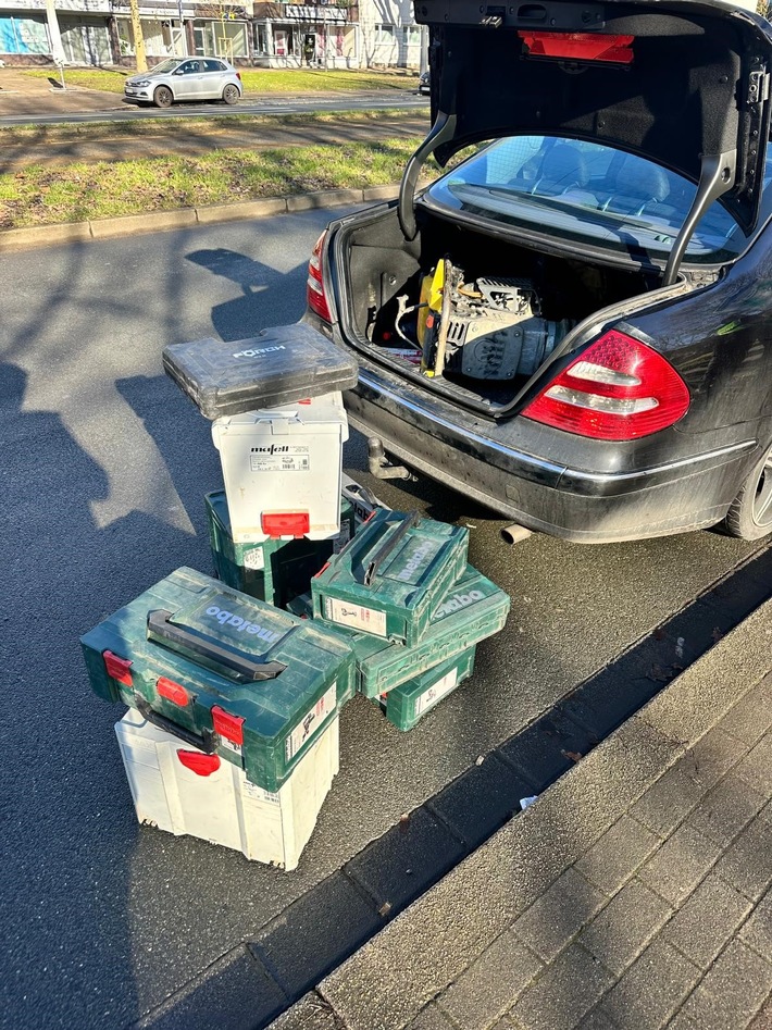 Einsatzkräfte der Polizei Gelsenkirchen konnten im Rahmen einer Verkehrskontrolle mehrere gestohlene Werkzeuge in einem Auto auffinden. Die Beamten kontrollierten am Mittwoch, 4. Februar 2026, auf der Hans-Böckler-Allee in der Feldmark das Auto eines 50-jährigen Mannes ohne festen Wohnsitz in Deutschland, da das Fahrzeug hinten sehr tief lag und ein Kind ohne angelegten Sicherheitsgurt im Auto saß.