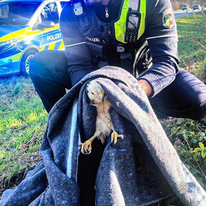 Die Greifvogelstation informierte gegen 13:50 Uhr die Polizei. Zwei Kollegen der Wache Nord in Wesel fuhren zum gemeldeten Fundort des Tieres. Mit einer Decke konnte der Mäusebussard eingefangen und an die Greifvogelstation in Wesel übergeben werden.