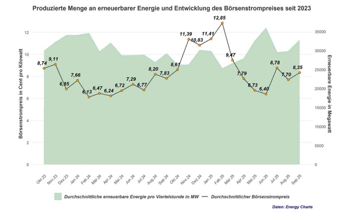 Im September 2025 lag der durchschnittliche Börsenstrompreis im Day-Ahead-Markt bei 8,35 Cent/kWh und damit leicht über dem Wert des Vormonats August (7,7 Cent/kWh).
