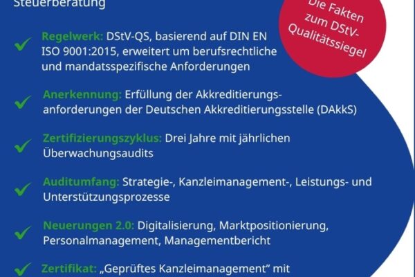 DStV-Qualitätssiegel 2.0: DQS stärkt Qualität und Vertrauen in der Steuerberatung / ISO 9001 integraler Bestandteil für ein zertifiziertes Kanzleimanagement